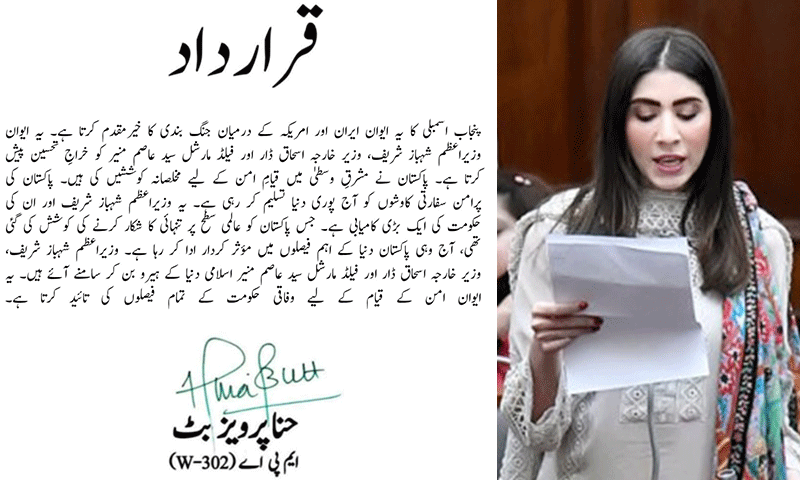 پنجاب اسمبلی نے ایک تاریخی قرارداد منظور کی ہے جسے رکن اسمبلی حنا پرویز بٹ نے پیش کیا۔ اس قرارداد میں امریکا اور ایران کے درمیان حالیہ جنگ بندی میں پاکستان کے کلیدی کردار کو سراہا گیا اور وفاقی حکومت کی سفارتی کامیابی کی بھرپور تائید کی گئی ہے۔