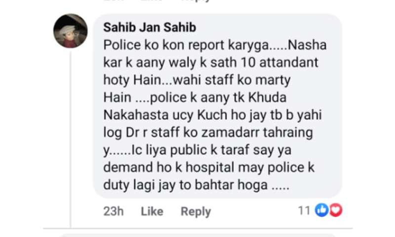 اس پر ردعمل دیتے ہوئے سوشل میڈیا صارف صاحب جان نے لکھا ہے کہ اگر کوئی بندہ نشے میں اسپتال آتا ہے تو اس کے ساتھ 8,10 افراد ہوتے ہیں جو اسپتال عملہ کو یرغمال بنا لیتے ہیں اور مار پیٹ بھی کرتے ہیں اور پولیس کی آمد پر اسپتال عملے کو ہی مورد الزام ٹھہراتے ہیں لہذا اسپتال میں پولیس کی تعیناتی کو لازمی قرار دی جائے۔