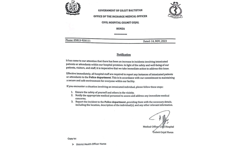 گلگت بلتستان کے ضلع ہنزہ کے غلمت گوجال اسپتال نے نوٹیفکیشن جاری کرتے ہوئے کہا ہے کہ اسپتال میں شراب کے عادی مریضوں اور ان کے تیمارداروں کی تعداد میں مسلسل اضافہ ہوتا جا رہا ہے جن سے اسپتال کو محفوظ رکھنے اور پرامن و محفوظ ماحول کو قائم رکھنے کے لیے ضروری ہے کہ حفاظتی تدابیر اپنائی جائیں۔