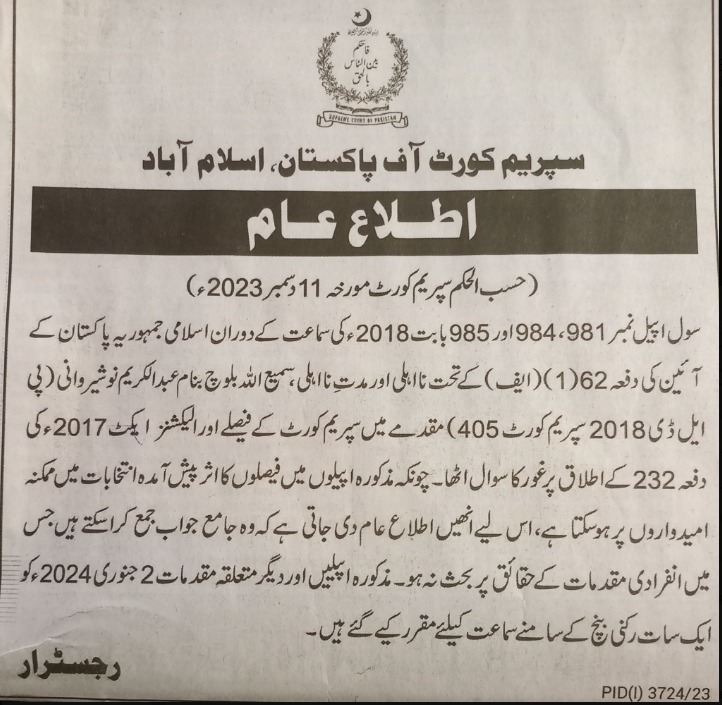 اشتہار کے متن میں کہا گیا ہے کہ آرٹیکل 62 ون ایف اور الیکشن ایکٹ کے سیکشن 232 کے تحت نااہلی کی مدت کا سوال اٹھا ہے، عدالتی فیصلے کا اثر آئندہ عام انتخابات میں امیدواروں پر بھی ہو سکتا ہے۔