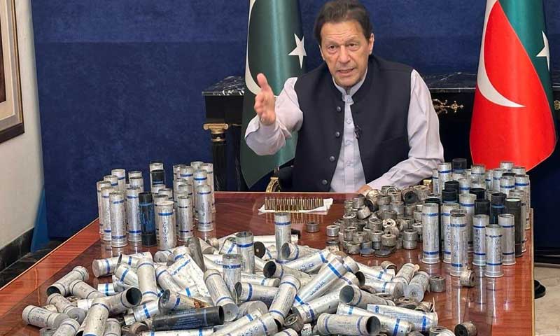 ویڈیو لنک سے گفتگو کرتے ہوئے عمران خان نے آنسو گیس کے خالی شیل دکھاتے ہوئے کہا کہ ‘یہ شیل کل سے میرے گھر میں پھینکے گئے ہیں، جو میرے گھر سے باہر پھینکے گئے ہیں، ساری رات یہ سلسلہ جاری رہا ہے اور ابھی جب میں آپ سے بات کر رہا ہوں اس وقت بھی شیلنگ ہورہی ہے’۔