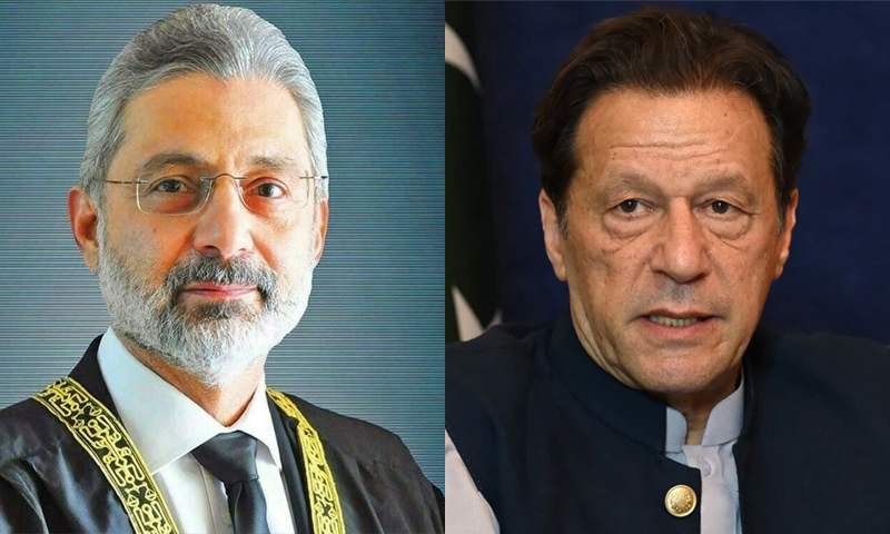 عمران خان نے چیف جسٹس قاضی فائز عیسیٰ کے نام خط میں لکھا ’آپ اور سپریم کورٹ کی جانب سے ان تمام معاملات پر بے عملی اس آئینی بحران کی شدت اور سنگینی میں اضافہ کرے گی پاکستان جس کی لپیٹ میں ہے اور ملک و قوم کو مکمل تباہی کے گڑھے میں دھکیل دے گی۔‘