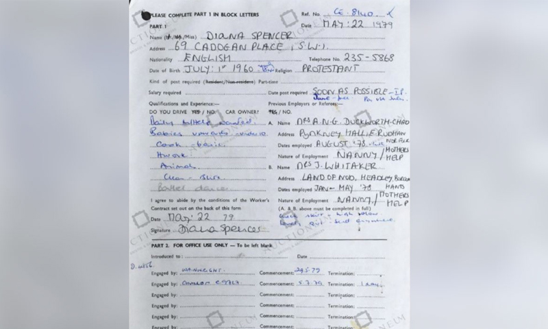 اس معاہدے کی دستاویز کو 17 سالہ لیڈی ڈیانا نے خود پُر کیا تھا۔ برطانوی نشریاتی ادارے ’بی بی سی‘ کے مطابق، معروف نینی ایجنسی ’سولو یور پرابلم لمیٹڈ‘ کے لیے دستخط کیے گئے۔ اس معاہدے میں لیڈی ڈیانا نے دانستہ اپنی عمر کم ظاہر کی تھی۔ انہوں نے جلد ملازمت اور تنخواہ حاصل کرنے کے لیے اس کنٹریکٹ میں اپنی پیدائش کا سال 1961ء کے بجائے 1960ء لکھا تھا۔