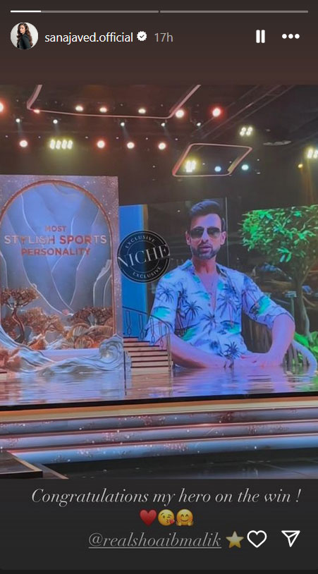 ایک اور اسٹوری میں ثنا جاوید نے ’ہم ایوارڈ شو‘ کی ایک ویڈیو بھی شیئر کی جس میں شعیب ملک کو ایوارڈ کے لیے نامزد کیا گیا تھا۔