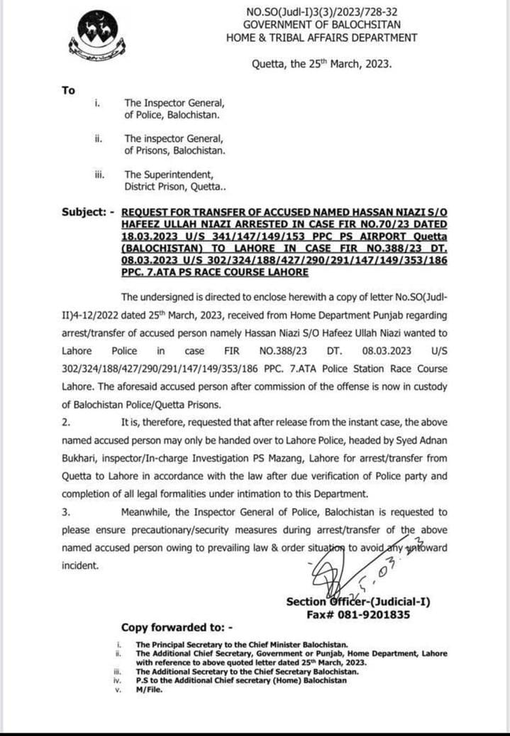 مراسلہ آئی جی پولیس ،آئی جی جیل خانہ جات اور سپرنٹنڈنٹ ڈسٹرکٹ جیل کوئٹہ کو لکھا گیا ہے جس میں کہا گیا ہے کہ محکمہ داخلہ پنجاب نے حسان نیازی کی حوالگی کی درخواست کی ہے۔