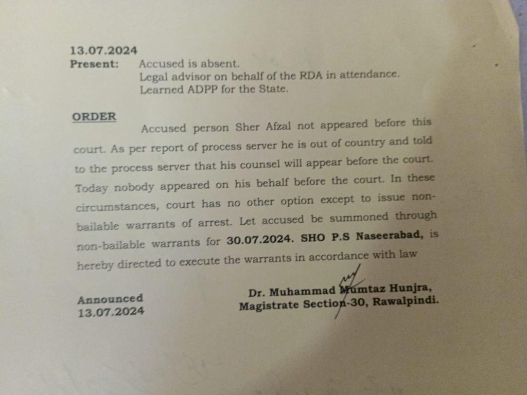 شیر افضل مروت کے ناقابلِ ضمانت وارنٹ گرفتاری سول جج ڈاکٹر محمد ممتاز ہنجرا نے ان کی عدالت میں غیر حاضری پر جاری کیے ہیں، رکن قومی اسمبلی کیخلاف تھانہ نصیرآباد میں راولپنڈی ڈیولپمنٹ اتھارٹی یعنی آر ڈی اے نے مقدمہ کررکھا ہے۔