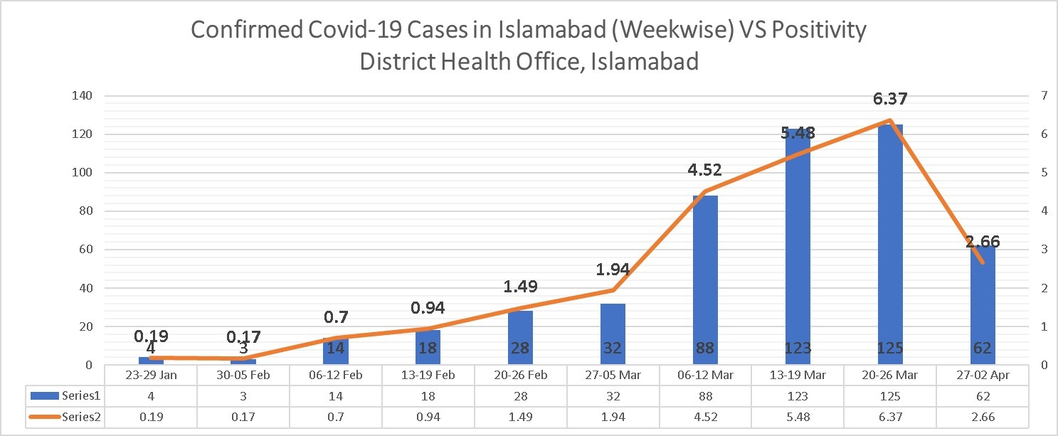 ڈسٹرکٹ ہیلتھ آفس کے مطابق مارچ کے آخری ہفتے میں کورونا کی مثبت شرح 6.37 فیصد تک ریکارڈ کی گئی۔20 سے 26 مارچ تک اسلام آباد میں 125 افراد کورونا میں مبتلا ہوئے۔