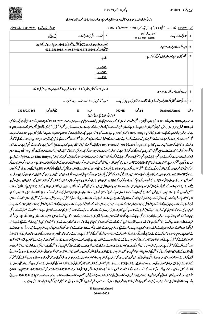 مزید یہ کہ ملزم عمران خان کا یہ عمل ملک و ریاست کی سالمیت کے لیے خطرہ ہے۔ ملزم نے اپنی تقاریر سے فوج، مختلف گروہوں اور طبقوں میں انتشار پھیلایا۔ ایف آئی آر مجسٹریٹ منظور احمد کی مدعیت میں درج کی گئی ہے۔