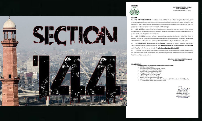 حکومت پنجاب نے صوبے بھر میں دفعہ 144 نافذ کرتے ہوئے صوبے میں ہر قسم کے احتجاج، جلوس اور ایسی تمام سرگرمیوں پر پابندی عائد کردی ہے۔