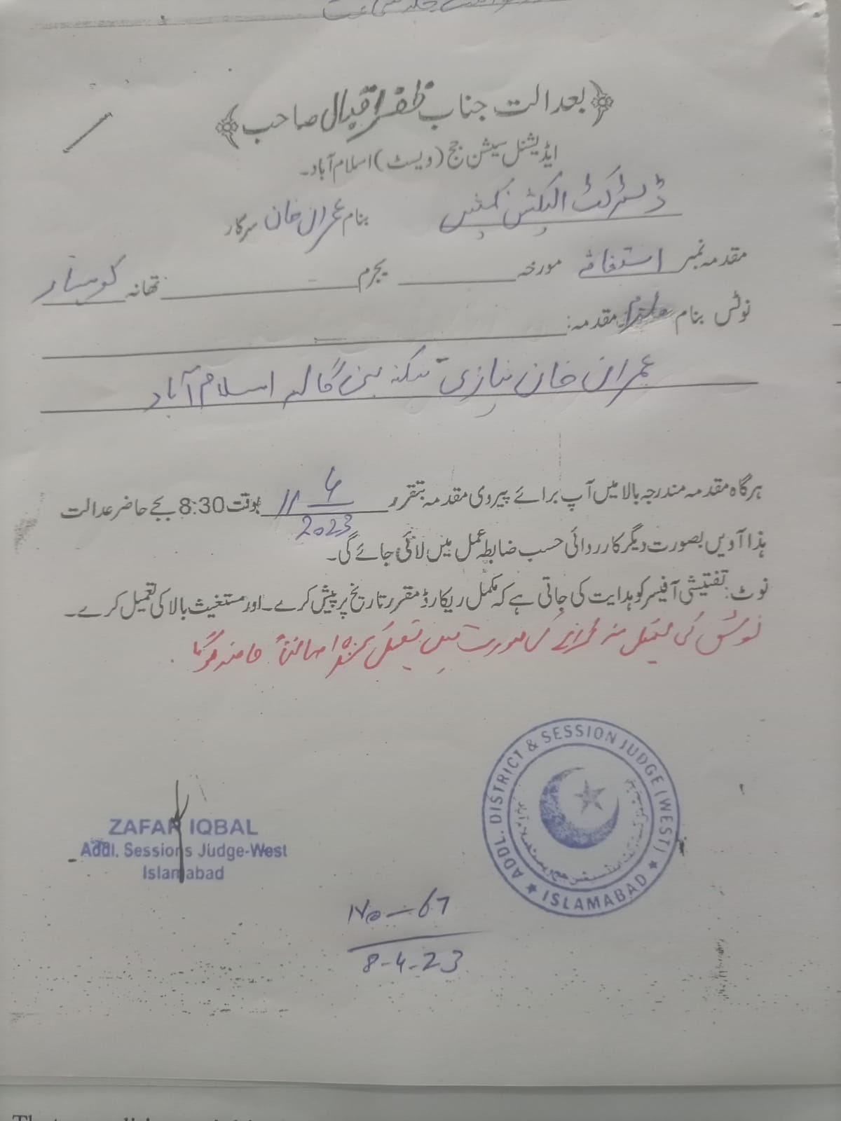 ایڈیشنل سیشن جج ظفر اقبال نے عمران خان کو 11 اپریل کو صبح ساڑھے 8 بجے طلب کیا ہے۔ سمن میں کہا گیا ہے کہ عدم پیشی کی صورت میں قانون کے مطابق کارروائی عمل میں لائی جائے گی۔