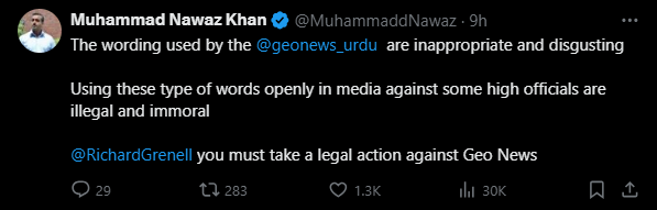 ایک صارف نے کہا کہ جیو کی جانب سے رچرڈ گرینل کے لیے ایسے الفاظ کا استعمال نامناسب ہے۔ اس قسم کے الفاظ کا کھلے عام استعمال غیر قانونی اور غیر اخلافی ہے، انہوں نے رچرڈ گرینل سے کہا کہ آپ کو جیو نیوز کے خلاف قانونی کارروائی کرنی چاہیے۔