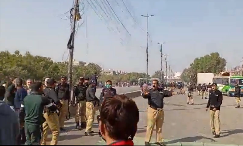 میڈیا رپورٹس کے مطابق نمائش چورنگی میں پولیس نے مظاہرین کے کیمپ اکھاڑ دیے ہیں، پولیس نے مظاہرین پر آنسو گیس کی شیلنگ کی جبکہ مظاہرین نے پولیس پر پتھراؤ کیا ہے۔