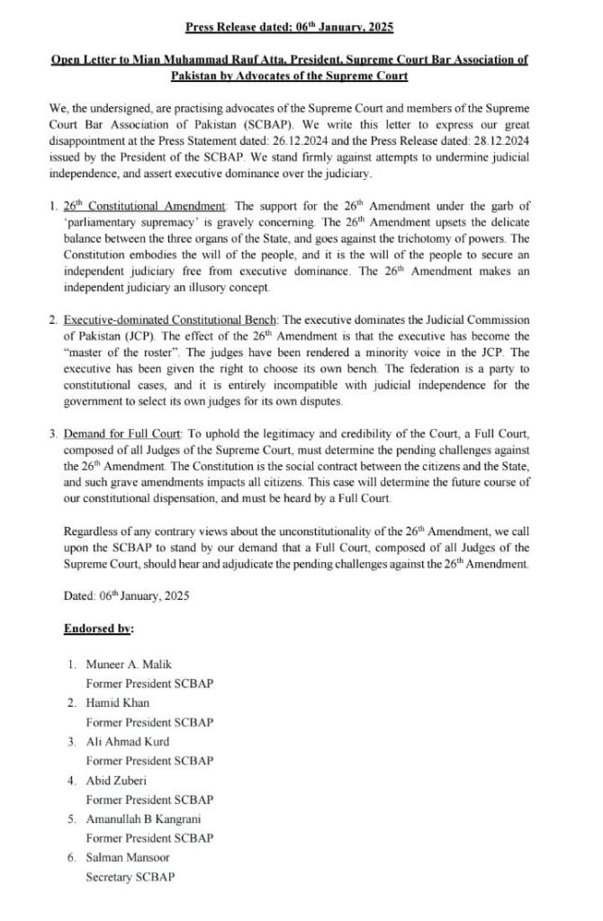 ’ہم، زیر دستخط۔۔۔ یہ خط بار ایسوسی ایشن کے صدر کی طرف سے 26 دسمبر کے بیان پر اپنی شدید مایوسی کا اظہار کرتے ہیں، ہم عدلیہ کی آزادی کو مجروح کرنے اور اس پر انتظامی غلبے کی کوششوں کے خلاف مضبوطی سے کھڑے ہیں۔‘