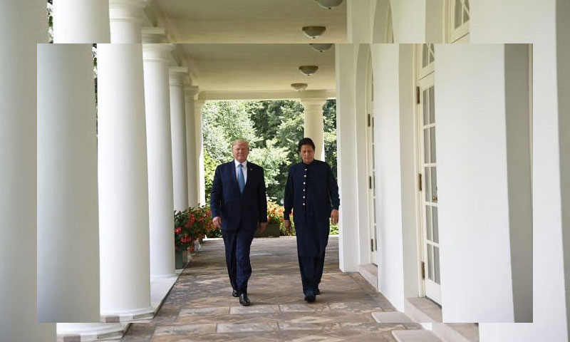 پوسٹ کے ساتھ ایک تصویر بھی منسلک کی گئی ہے جس میں سابق وزیراعظم عمران خان کو دورہ امریکا کے دوران  صدر ڈونلڈ ٹرمپ  کے ساتھ واک کرتے ہوئے دکھایا گیا ہے۔