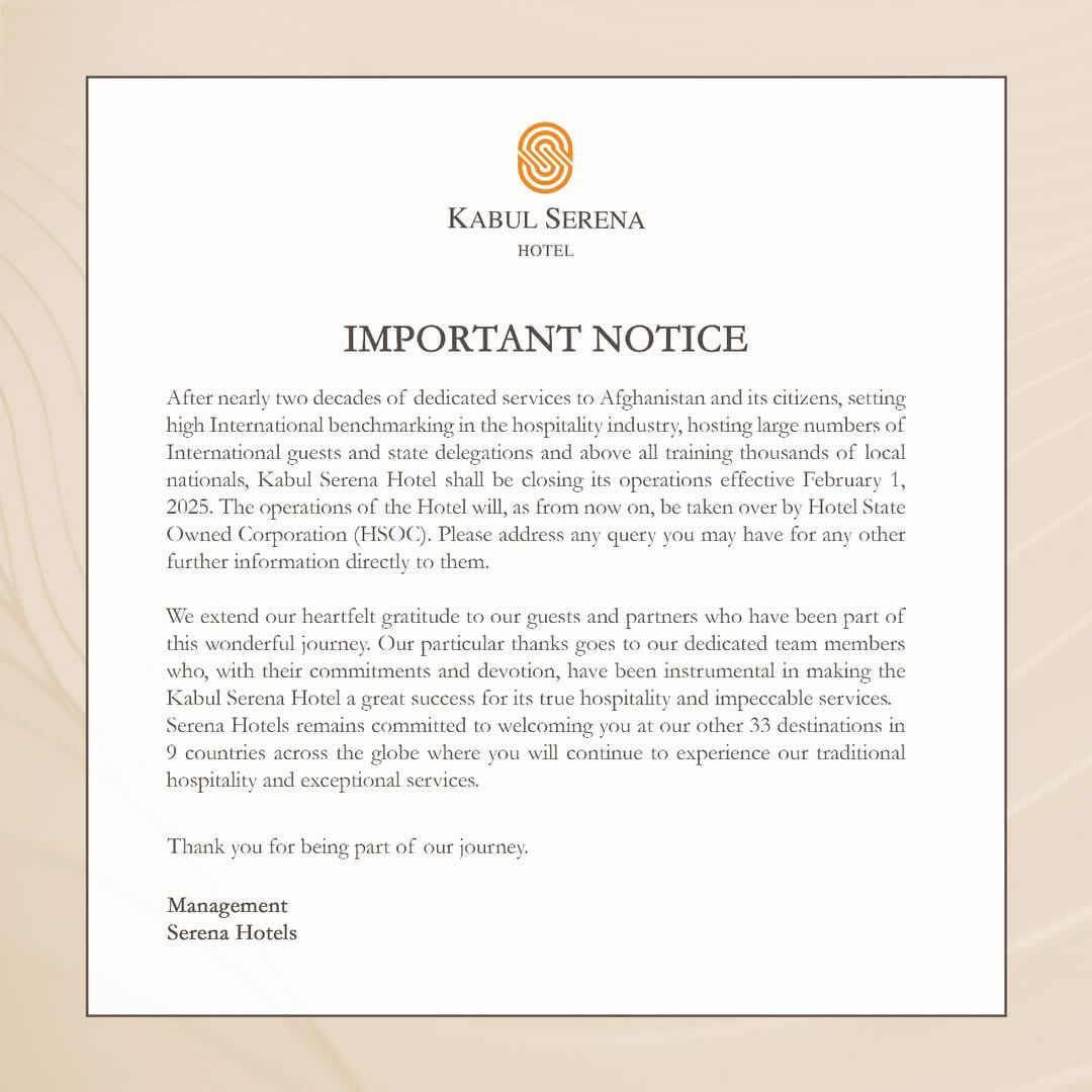سرینا کی جانب سے جمعہ کی شب جاری ہونے والے ایک بیان میں کہا گیا ہے کہ کابل سرینا ہوٹل یکم فروری 2025 سے اپنی آپریشنل سرگرمیاں اور سروسز بند کر دے گا۔