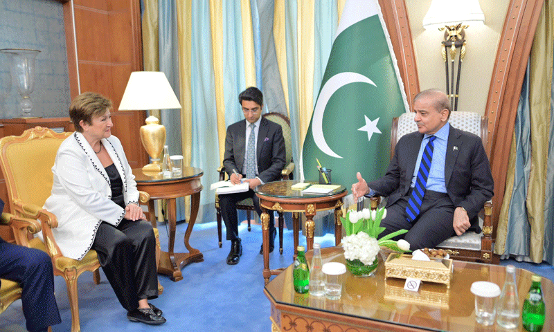 ملاقات میں کرسٹالینا جارجیوا نے آئی ایم ایف پروگرام پر موثر عمل درآمد پر حکومتی کاوشوں کو سراہا جبکہ وزیراعظم شہباز شریف نے ادارہ جاتی اصلاحات کے نفاذ پر پاکستان کے عزم کو اجاگر کیا۔