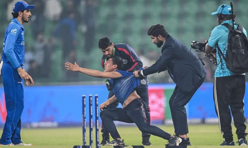 دنیا بھر میں اپنے پسندیدہ کھلاڑیوں سے ذاتی طور پر ملنے کے لیے شائقین کی جانب سے میدان میں جانے کے واقعات عام ہیں۔ ایسا ہی ایک واقعہ افغانستان اور انگلینڈ کے درمیان چیمپیئنز ٹرافی کے میچ کے اختتام پر بھی پیش آیا جب ایک تماشائی لاہور کے قذافی اسٹیڈیم کے گراؤنڈ میں آ گیا۔ جسے سکیورٹی اہلکاروں نے حراست میں لے لیا۔