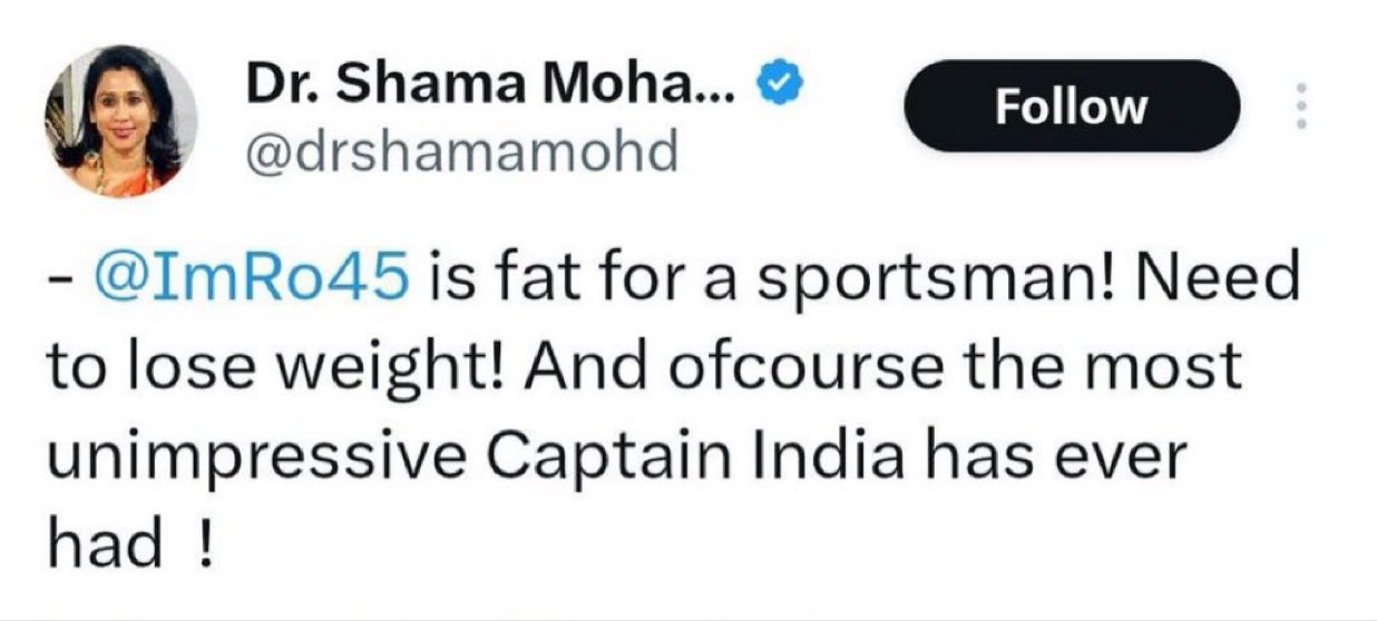 واضح رہے کہ شمع محمد نے ایکس پر پوسٹ کرتے ہوئے روہت شرما کو موٹا قرار دے کر کہا تھا کہ وہ بھارت کا سب سے غیر متاثرکن کپتان ہیں۔