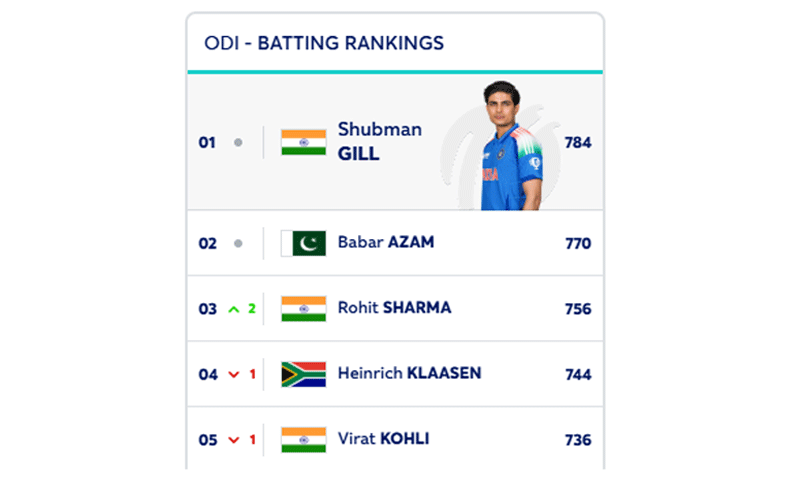 انٹرنیشنل کرکٹ کونسل (آئی سی سی ) نے نئی پلیئرز رینکنگ جاری کر دی ہے،  بھارت کے شبمن گل اور پاکستان کے بابراعظم بدستور پہلی اور دوسری پوزیشن پر برقرار ہیں۔