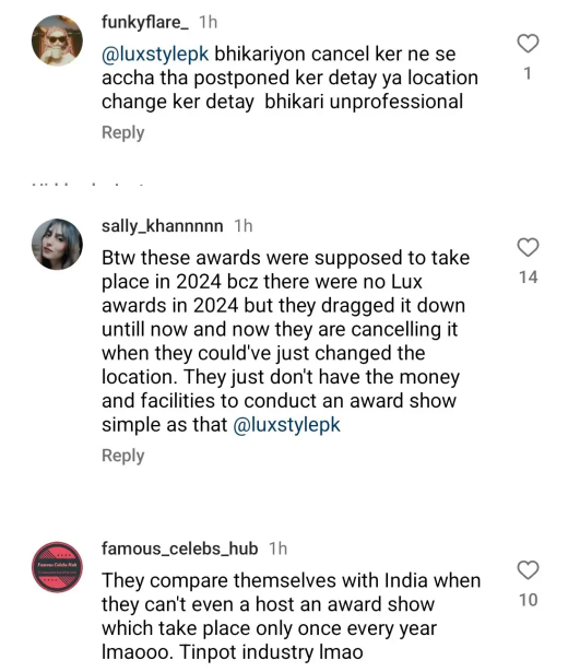 ایک اور صارف نے لکھا آپ یہ نہیں کر سکتے۔ پاکستان میں مشکل سے ایوارڈ شو ہوتے ہیں۔ ایک لکس اسٹائل ایوارڈز تھا، اب وہ بھی منسوخ کر دیا گیا ہے۔ آپ لوگ ایوارڈ شو کیسے نہیں کر سکتے؟ آپ کی صنعت کیسے ترقی کرے گی؟ یہ ناانصافی ہے۔