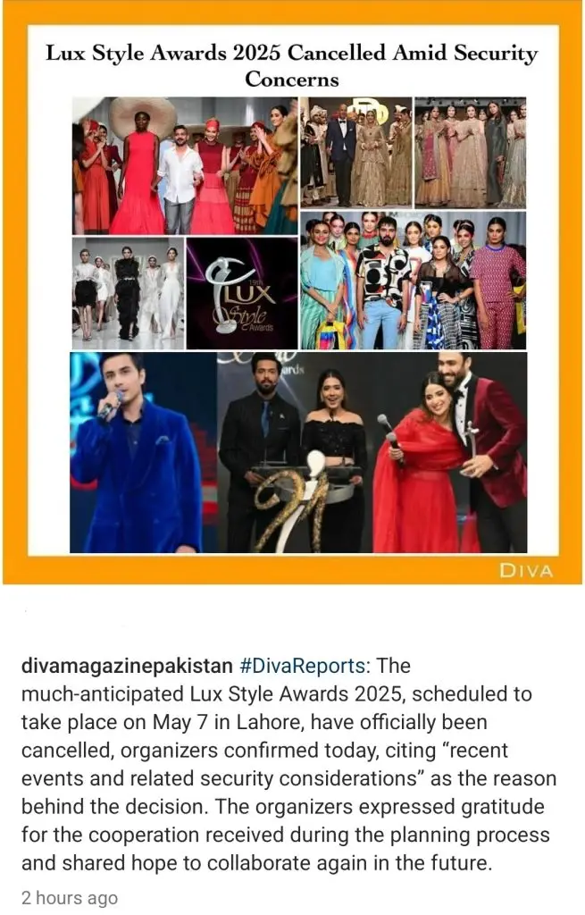 تفصیلات کے مطابق، لکس اسٹائل ایوارڈز 2025 کو باقاعدہ طور پر منسوخ کر دیا گیا ہے۔ ایوارڈز کی منسوخی کی وجہ سیکیورٹی خدشات بتائی گئی ہے۔ منتظمین نے اسپانسرز اور مداحوں کا شکریہ ادا کیا اور امید ظاہر کی کہ مستقبل میں دوبارہ ایک ساتھ کام کیا جائے گا۔