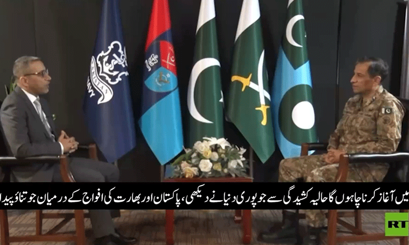 ڈائریکٹرجنرل آئی ایس پی آر لیفٹینٹ جنرل احمد شریف چوہدری نے آر ٹی عریبیہ سے خصوصی گفتگو کرتے ہوئے کہا ہے کہ پاک بھارت تناؤ کو سمجھنے کے لیے اس کے پس منظر میں جانا ضروری ہے۔