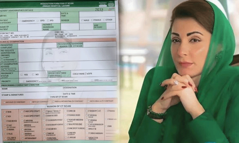 سوشل میڈیا پر چند تصاویر وائرل ہو رہی ہیں جس میں پنجاب کے سی ٹی سکین کے فارم پر بھی وزیراعلیٰ پنجاب مریم نواز کی تصویر نظر آنے لگی ہے جس پروزیر اعلیٰ پنجاب کی شائع کردہ تشہیری مہم کو ذاتی نمائش اور سرکاری وسائل کا استحصال قرار دیا جا رہا ہے۔