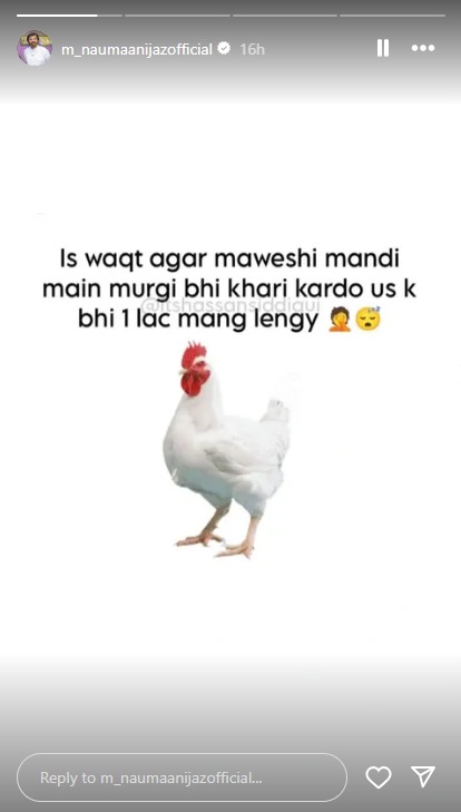 سینئر اداکار نعمان اعجاز بھی جانوروں کی قیمت سے پریشان نظر آتے ہیں انہوں نے فوٹو اینڈ ویڈیو شیئرنگ ایپ انسٹاگرام پر ایک اسٹوری شیئر کی جس میں لکھا کہ ’اس وقت اگر مویشی منڈی میں مرغی بھی کھڑی کر دو تو اس کے بھی ایک لاکھ مانگ لیں گے‘۔