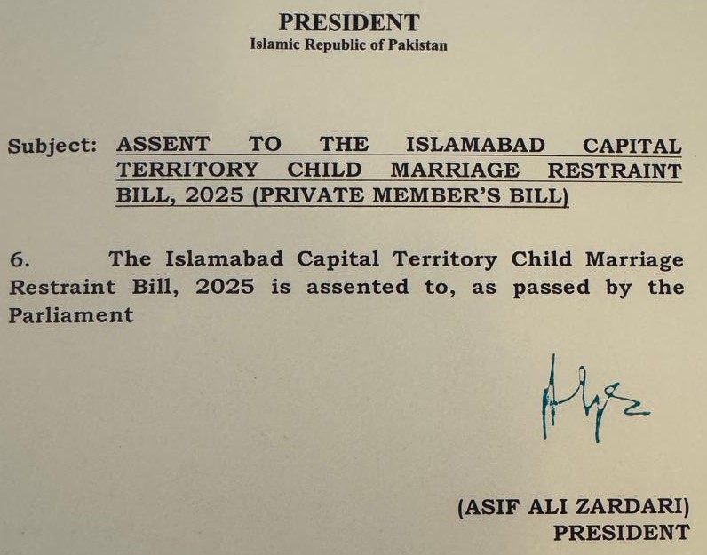 صدرِ مملکت آصف علی زرداری نے کم عمری (نابالغ) کی شادی کی ممانعت کے بل پر دستخط کر دیے، جس کے بعد یہ بل باقاعدہ قانون بن گیا ہے۔ بل قومی اسمبلی میں شرمیلا فاروقی اور سینیٹ میں شیری رحمٰن کی جانب سے پیش کیا گیا تھا۔