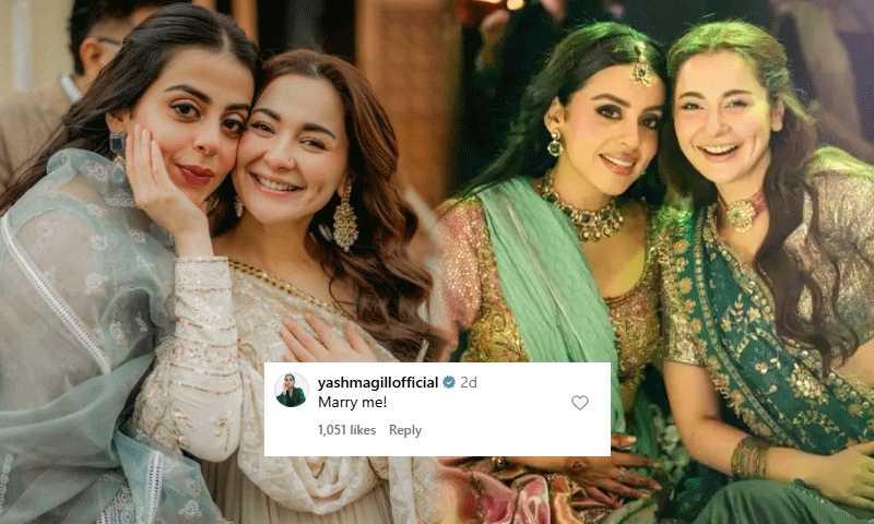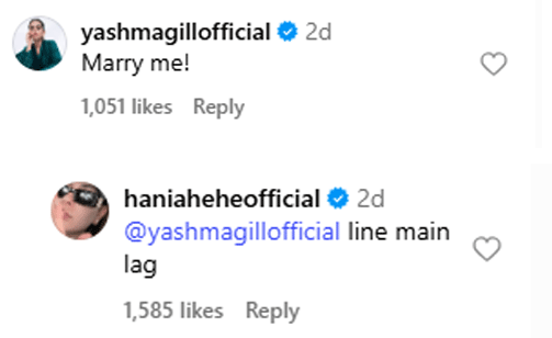 حال ہی میں ہانیہ عامر نے اپنے آفیشل انسٹاگرام پر کچھ تصاویر شیئر کیں، جن پر تبصرہ کرتے ہوئے یشما گل نے لکھا کہ مجھ سے شادی کرلو جس کا جواب دیتے ہوئے ہانیہ عامر نے لکھا ’لائن میں لگ‘۔