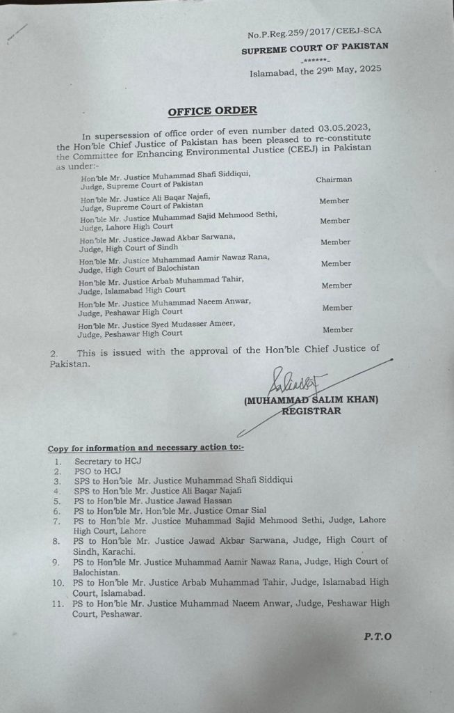 چیف جسٹس آف پاکستان جسٹس یحییٰ آفریدی نے ماحولیاتی انصاف کو فروغ دینے کے لیے کمیٹی کی تشکیل نو کرتے ہوئے جسٹس شفیع صدیقی کی سربراہی میں 8 رکنی کمیٹی تشکیل دی ہے۔
