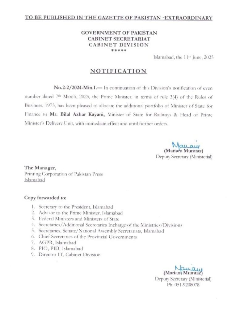 وزیراعظم شہباز شریف نے وزیر مملکت برائے ریلوے بلال اظہر کیانی کو وزیر مملکت برائے خزانہ کا اضافی چارج سونپ دیا ہے۔ وزیراعظم آفس سے جاری اعلامیے کے مطابق یہ فیصلہ ملک کے مالیاتی شعبے میں ہم آہنگی اور بہتر رابطہ کاری کے لیے کیا گیا ہے۔