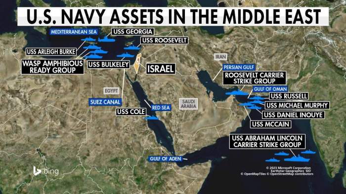 خلیج فارس میں امریکا کا 5واں بحری بیڑا بحرین میں قائم ہے، جہاں سے وہ خلیج فارس، بحر عرب، اور خلیج عمان تک کی نگرانی کرتا ہے۔ اس بیڑے کا حصہ طیارہ بردار جہاز USS Carl Vinson ہے جو اپنے فضائی اسکواڈرن، تباہ کن میزائل کشتیوں اور آبدوزوں کے ساتھ کسی بھی اندرونی ہدف پر حملے کی صلاحیت رکھتا ہے۔