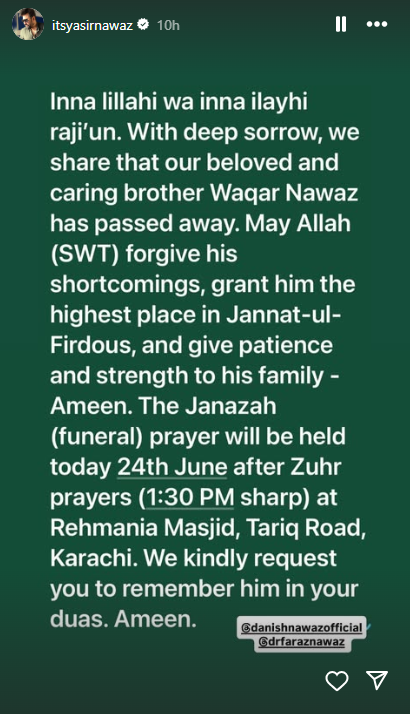 یاسر نواز نے فوٹو اینڈ ویڈیو شیئرنگ ایپ انسٹاگرام پر ایک اسٹوری شیئر کی جس میں انہوں نے لکھا کہ گہرے رنج اور غم کے ساتھ یہ اطلاع دے رہا ہوں کہ ہمارے پیارے اور شفیق بھائی وقار نواز کا انتقال ہوگیا ہے، اللہ ان کی مغفرت فرمائے، جنت الفردوس میں اعلیٰ مقام عطا فرمائے اور ان کے اہلخانہ کو صبر عطا اور حوصلہ عطا فرمائے۔ انہوں نے مزید کہا کہ آپ سب سے درخواست ہے کہ مرحوم کو اپنی دعاؤں میں یاد رکھیں۔