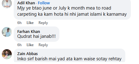 عادل خان کا کہنا تھا کہ جون اور جولائی کے مہینے میں روڈ کارپیٹنگ کا کام ہوتا ہی نہیں ہے یہ جماعت اسلامی کے کارنامے ہیں، جبکہ ایک صارف کا کہنا تھا کہ ان کو صرف بارش میں کام یاد آتا ہے ویسے یہ سوئے رہتے ہیں۔
