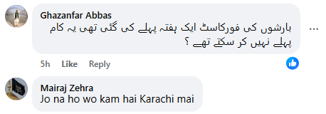 ایک صارف کا کہنا تھا کہ کن نااہل لوگوں کو ملک پر مسلط کر دیا ہے۔ غضنفر عباس نے کہا کہ بارشوں کا ایک ہفتہ پہلے ہی بتا دیا گیا تھا تو یہ کام پہلے مکمل نہیں کیا جا سکتا تھا، جبکہ ایک سوشل میڈیا صارف نے کہا کہ جو کہیں نہ ہو وہ کام کراچی میں ہوتا ہے۔