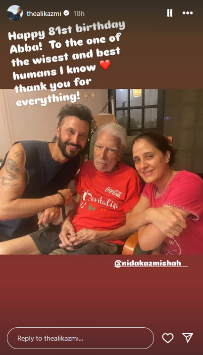 تصویر شیئر کرتے ہوئے علی کاظمی نے لکھا کہ،ابا کو 81ویں سالگرہ مبارک ہو۔ ساتھ ہی انہوں نے کہا کہ یہ وہ انسان ہیں جو سب سے زیادہ سمجھدار اور بہترین ہیں۔ اور اپنے والد کا ہر چیز کے لیے شکریہ ادا کیا۔
