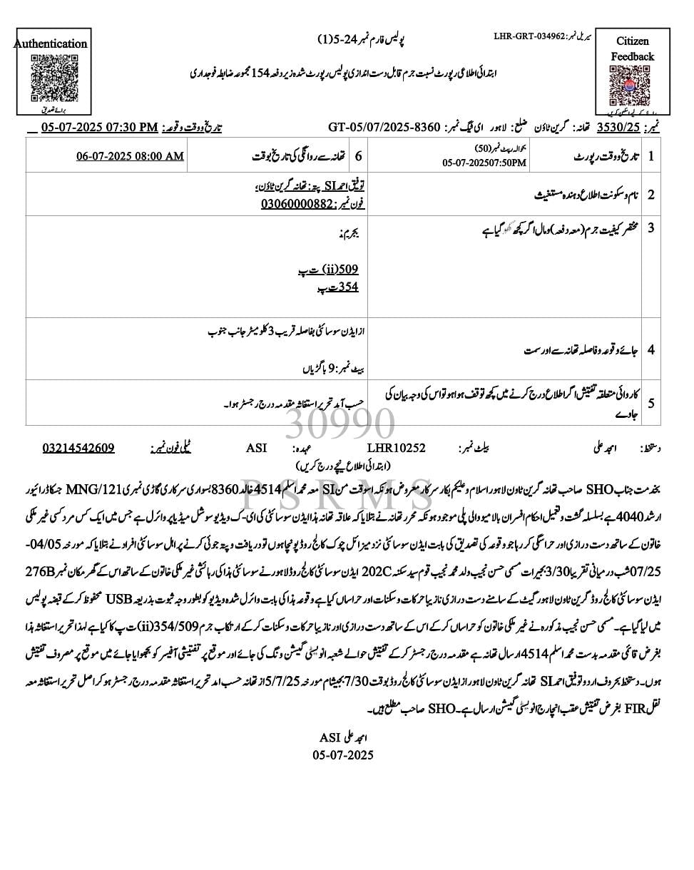 واقعے کی اطلاع ملتے ہی گرین ٹاؤن پولیس نے ایف ائی آر درج کر کے کاروائی کا اغاز کیا تھا اور سیف سٹی اور سی سی ٹی وی کی مدد سے ملزم کو 12 گھنٹے میں گرفتار کر لیا گیا۔