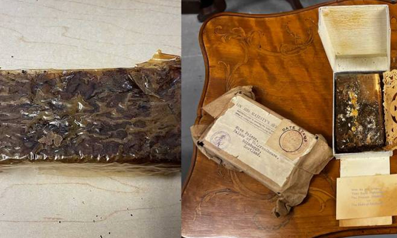 یہ 78 سال پرانا فروٹ کیک الکحل میں بھگو کر محفوظ کیا گیا تھا، جو برسوں تک ایک دراز میں رکھا گیا۔ کیک کا یہ ٹکڑا بکنگھم پیلس میں ہونے والی شادی کی تقریب کے دوران چیف پیٹی آفیسر ایف لاؤنز کو دیا گیا تھا۔ بعد ازاں یہ ٹکڑا ان کے بیٹے، اور پھر بہو کو منتقل ہوا۔
