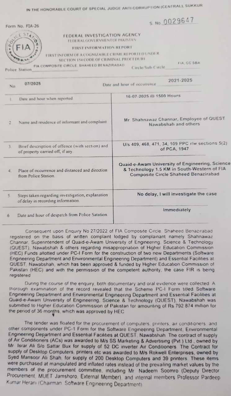 اس کے علاوہ خریداری کمیٹی کے ممبران ڈپٹی ڈائریکٹر ندیم سومرو، چیئرمین سافٹ ویئر انجینئرنگ پروفیسر پردیپ کمار، چیئرمین ٹیلی کمیونیکیشن عدنان آرائیں، چیئرمین انوائرمنٹ انجینئرنگ عبدالناصر لغاری سمیت دیگر پر مقدمہ درج کیا گیا ہے۔