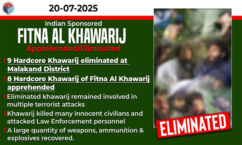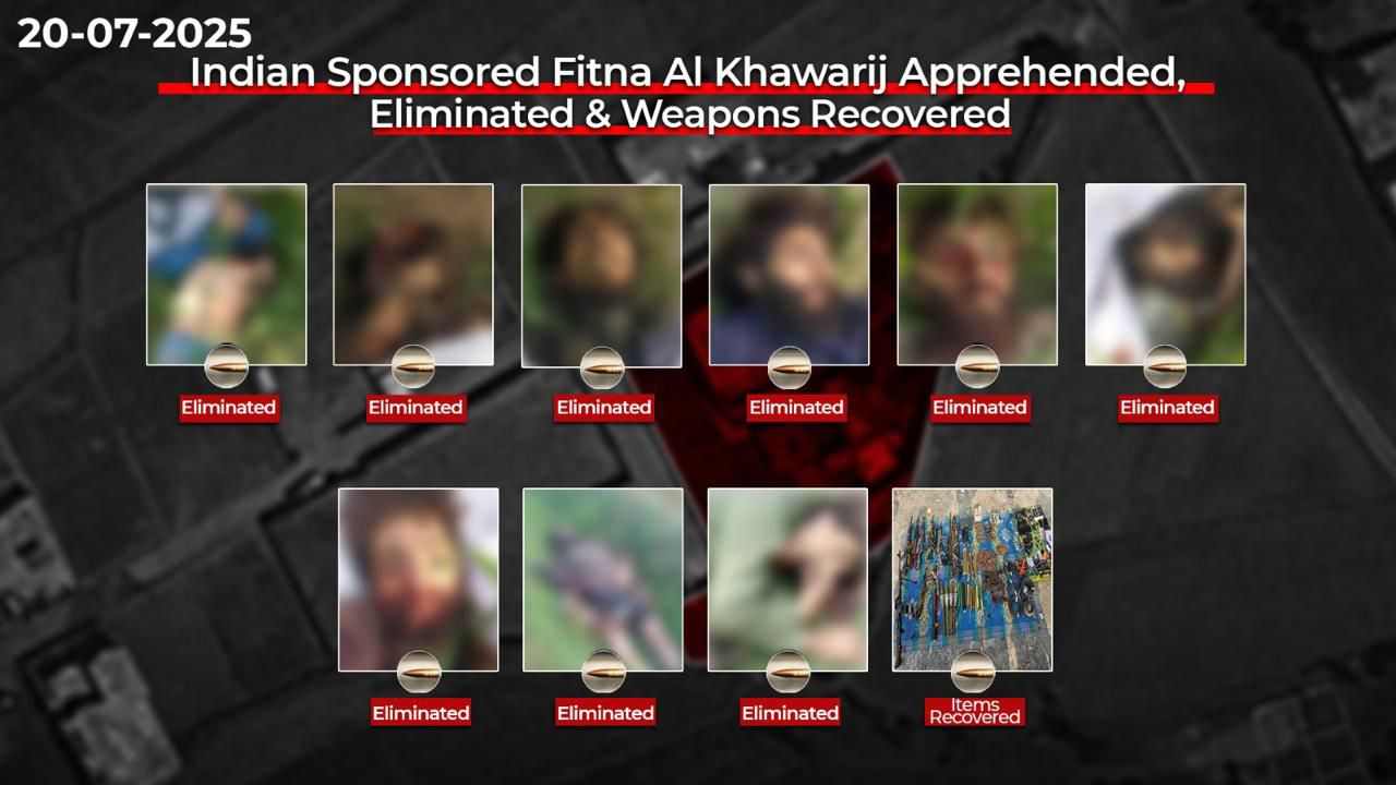 پاک فوج کے شعبہ تعلقات عامہ (آئی ایس پی آر) کے مطابق سیکیورٹی فورسز نے 16 سے 20 جولائی تک پولیس، لیویز، سی ٹی ڈی اور ضلعی انتظامیہ کے ساتھ مل کر فتنہ الخوارج کے دہشتگردوں کے خلاف آپریشن کیا۔