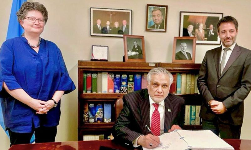 پاکستان کے نائب وزیرِاعظم و وزیرِ خارجہ اسحاق ڈار نے اقوام متحدہ کے صدر دفتر نیویارک میں’قانونِ سمندر سے متعلق اقوام متحدہ کے کنونشن کے تحت قومی دائرہ اختیار سے باہر علاقوں میں سمندری حیاتیاتی تنوع کے تحفظ اور پائیدار استعمال‘ کے معاہدے پر دستخط کیے ہیں۔