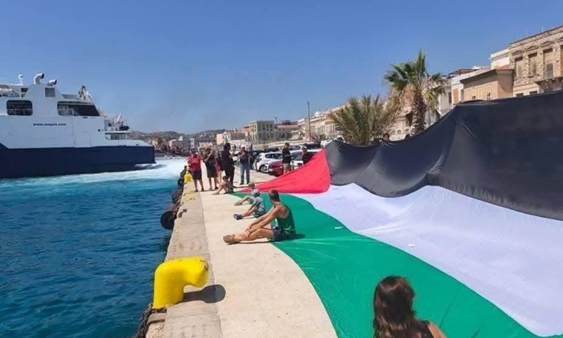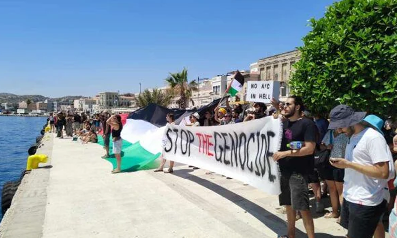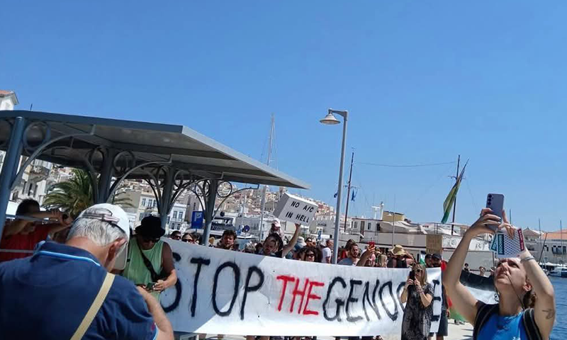 منگل کے روز جب یہ سیروس بندرگاہ پہنچی، تو 300 سے زائد مظاہرین نے فلسطینی پرچم لہرا کر اور اسرائیل مخالف نعرے لگا کر مسافروں کو اترنے سے روک دیا۔
