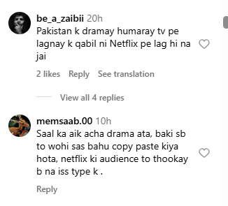 ایک سوشل میڈیا صارف کا کہنا تھا کہ سال میں صرف ایک نیا ڈرامہ آتا ہے باقی تو ہی ساس، بہو کی روایتی کہانیاں ہیں۔ ان کا مزید کہنا تھا کہ نیٹ فلکس کی آڈینس ایسے ڈرامے بالکل بھی نہیں دیکھے گی۔ اقرا نامی صارف لکھتی ہیں کہ ’ساس بہو کے ڈرامے دیکھانے ہیں یا مردوں کا ظلم‘۔