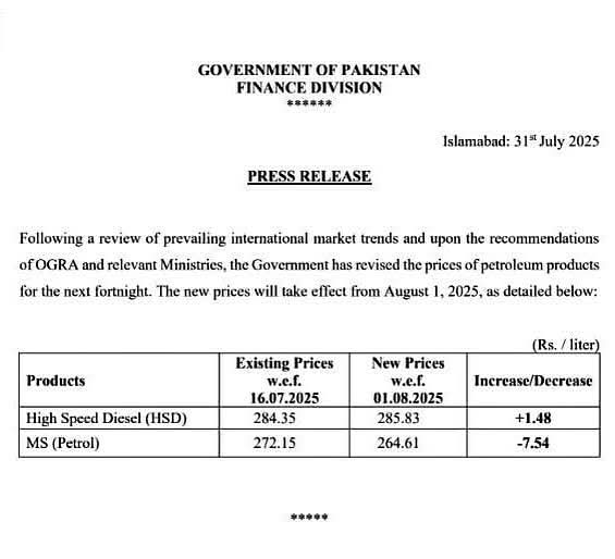 وزارت خزانہ کی جانب سے پیٹرول اور ہائی اسپیڈ ڈیزل کی نئی قیمتوں کا نوٹیفکیشن بھی جاری کردیا گیا ہے جبکہ نئی قیمتوں کا اطلاق آج رات 12 بجے سے ہوگا۔