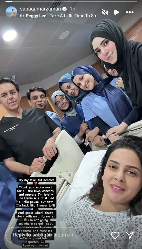 صبا قمر نے اسپتال سے انسٹاگرام پر ایک تصویر شیئر کی جس میں وہ اپنے ٹیم ممبرز اور نگہداشت کرنے والوں کے ساتھ موجود ہیں۔ انہوں نے اپنے مداحوں کا شکریہ ادا کرتے ہوئے کہا: