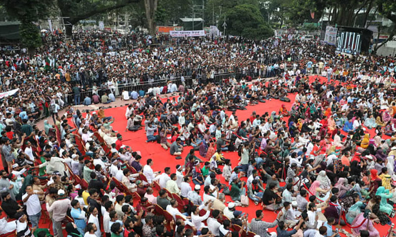 اجتماع کے دوران مطالبہ کیا گیا کہ تمام سیاسی جماعتوں کی باہمی رضا مندی سے تشکیل دیے گئے’جولائی چارٹر‘ کو 5 اگست تک قانونی حیثیت دی جائے اوراس پرعملدرآمد شروع کیا جائے۔اجتماع کے مقام پر شہدا کے خاندانوں اور زخمیوں کے لیے نشستیں مختص کی گئیں، جبکہ 6 بڑی اسکرینوں پر براہِ راست خطاب دکھایا گیا۔ رہنما سرخ قالین پر بیٹھے جبکہ کارکنان بینرز، جھنڈوں اور نعروں کے ساتھ مختلف قافلوں کی صورت میں شریک ہوئے۔