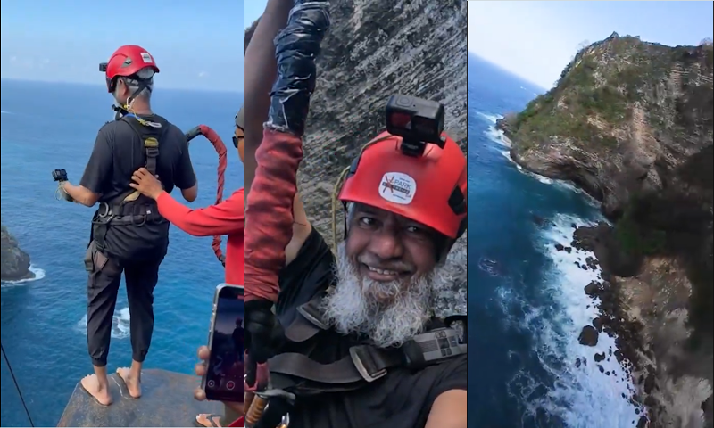 Dr Zakir Naik Bungee Jumping from 430 feet (130 metre or 45 floors) at Turtle Beach Nusa Penida, Bali, Indonesia pic.twitter.com/M2xDfS34qC