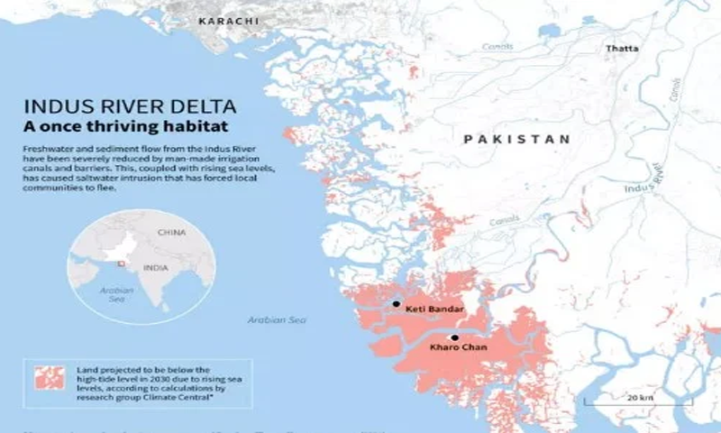 اے ایف پی کی ایک رپورٹ کے مطابق انڈس ڈیلٹا کا علاقہ، جہاں دریائے سندھ بحیرہ عرب سے جا ملتا ہے، تیزی سے سمندری پانی کے رحم و کرم پر آتا جا رہا ہے۔ زمین کھاری ہو چکی ہے، پانی پینے کے قابل نہیں رہا اور ایک قدیم طرز زندگی جو زراعت اور ماہی گیری سے جڑی تھی، قصۂ پارینہ بنتی جا رہی ہے۔