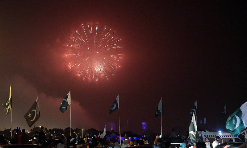 وفاقی دارالحکومت اسلام آباد کے سینٹورس مال کے باہر لوگوں کی بڑی تعداد موجود تھی، جنہوں نے رات کے 12 بجتے ہی شاندار آتش بازی کا مظاہرہ کیا، اس کے علاوہ پاکستان زندہ باد کے نعرے بھی لگائے گئے۔
